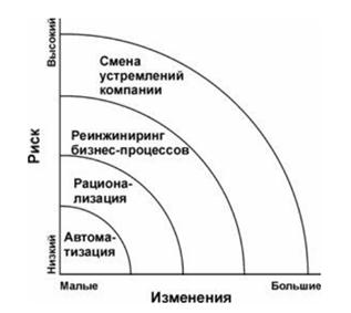 Внедрение информационных технологий может приводить к организационным изменениям различной степени: от минимальных до далеко идущих. Всё зависит от стратегии компании, предметной области её деятельности, от уровня развития сети бизнес-процессов, от степени интегрированности информационных ресурсов и, конечно, от решимости и настойчивости высшего руководства предприятия довести начатые преобразования до логического завершения.