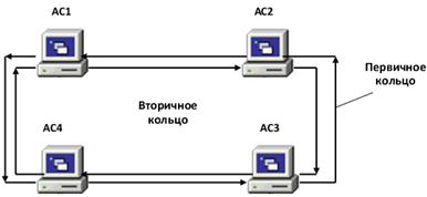 Причинами разработки новой сетевой технологии стали возросшие требования к пропускной способности и надежности локальных сетей. Технология FDDI обеспечивает передачу данных по двойному кольцу оптоволоконного кабеля со скоростью 100 Мбит/с (рис. 7). Протяженность кольца может составлять до 100 км. Максимальное количество абонентских систем – 500. Максимальное расстояние между АС – 2 км при использовании многомодового оптоволокна и 6-8 км – при одномодовом оптоволокне.