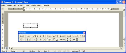 Для вставки новой формулы в текст, начиная с позиции курсора, нужно воспользоваться командой Вставка - Объект. В появившееся на экране диалоговом окне Вставка объекта выбирается параметр - MicrosoftEquation 3.0. При этом окно MicrosoftWord будет содержать видоизмененное меню, новую панель инструментов Формула с кнопками-шаблонами разных символов, а также поле для введения формулы (Рис.5).