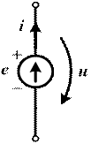 | Идеальный источник ЭДС (e), это активный элемент, напряжение на зажимах которого не зависит от протекающего через этот источник тока, при этом полагают, что у такого источника внутреннее сопротивление равно нулю. |