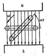 | Простейшим генератором синусоидальной ЭДС может служить прямоугольная катушка с числом витков w и, которая, вращается с постоянной угловой скоростью в однородном магнитном поле вокруг собственной оси, перпендикулярной к направлению линий магнитной индукции. При этом, пронизывающий катушку магнитный поток, будет изменяется, а в самой катушке, по закону электромагнитной индукции, индуктируется переменная ЭДС. |