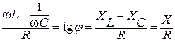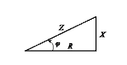 | Если разделить все стороны треугольника напряжений на общий множитель I, получим подобный ему треугольник сопротивлений с гипотенузой Z и катетами R и X. Из прямоугольного треугольника следует: , , . |