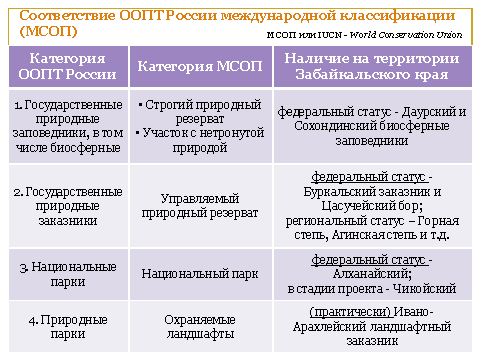 Согласно классификации Международного союза охраны природы (МСОП или IUCN - World Conservation Union) выделяются 7 основных природоохранных категорий: