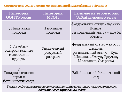 Эти объекты вместе с так называемыми биосферными резерватами ЮНЕСКО составляют элементы глобального экологического каркаса на территории России.