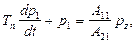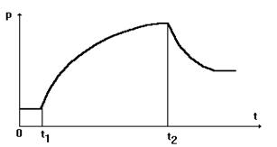 На рисунке приведен пример изменения давления в междроссельной камере. В момент времени t 1, давление увеличивается при увеличении скачком параметров А11 или p z, в момент времени t 2 - давление уменьшается при уменьшении скачком параметров А11 или p z. Сравнить с точным решением в разделе 5.4.
