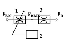 Регуляторы давления (РД) применяются в пневмосистемах для понижения давления до заданного уровня и его стабилизации с заданной точностью. РД применяются в схемах ИСГ для понижения давления от уровня давления в баллоне до давления на входе в привод. Принцип действия РД основан на поддержании постоянного давления в междроссельной камере, которая образована регулируемым дросселем 1, находящимся в составе РД, и постоянным дросселем 3, которым является потребитель (привод).