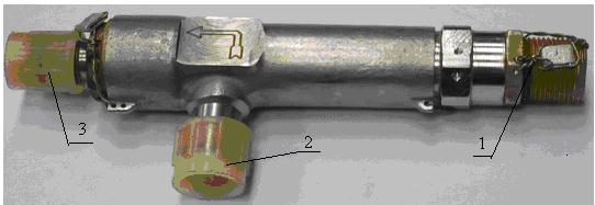 Ниже прведен пример конструктивного исполнения регулятора давления. С правой стороны виден (1) запломбированный узел настройки регулятора на номинальный режим. Входной (2)и выходной (3) штуцеры закрыты технологическими заглушками.