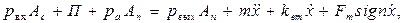 Основной характеристикой регулятора давления (РД) является зависимость выходного давления p вых от входного давления р вх. Для вывода уравнения регулятора давления необходимо рассмотреть равновесие сил, приложенных к подвижной системе РД. При выводе уравнение примем следующие обозначения: А с - площадь седла клапана, на которую действеет сила от давления газа в направлении движения подвижной системы, А п - площадь поршня, определяемая площадью чувствительного элемента, на которую действует выходное давление. П - упругая сила пружины, П о- предварительное поджатие пружины, с - жесткость пружины, m - масса подвижных частей РД, k вт - коэффициент вязкого трения в подвижной системе РД, F т - сила трения, x - перемещение подвижной системы РД.