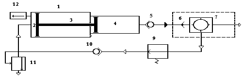 На схеме обозначено: 1 - вытеснительная емкость, 2- полость для вытесняющего газа, 3 - пустая полость, 4 - полость с гидразином, 5,10- обратные клапаны, 6 - катализатор разложения, 7 - выходное устройство, 8 - выходной патрубок, 9 - регулятор давления, 11- сбросной клапан, 12 - пиропатрон. Пример исполнения катализатора разложения приводится ниже.