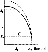 Следует заметить, что кривая производственных возможностей никогда не бывает вогнутой. Она всегда имеет выпуклую форму. Это объясняется тем, что из-за неполной взаимозаменяемости ресурсов производство каждой дополнительной единицы блага В требует отказа от все большего количества блага А, и наоборот.