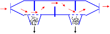 Наиболее простыми являются пылеосадительные камеры Они применяются в основном для предварительной очистки газов от крупной пыли (с размером частиц 100 мкм и более) и одновременно для охлаждения газа. Камера представляет собой пустотелый или с полками короб прямоугольного сечения с бункером внизу для сбора пыли. Площадь сечения камеры значительно больше площади подводящих газоходов, вследствие чего газовый поток движется в камере замедленно — около 0,5 м/с и пыль оседает (рис. 1).