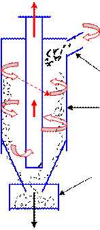 Циклоны различных типов получили широкое применение для сухой очистки газов. Это механические обеспыливающие устройства, в которых очистка газа основана на использовании инерционных свойств частиц пыли. Циклоны являются наиболее характерными представителями сухих инерционных пылеуловителей. Они, как правило, имеют простую конструкцию, обладают большой пропускной способностью и несложны в эксплуатации. Общая схема одной из конструкций циклона представлена на рис.3. Запыленный воздух вводится тангенциально в верхнюю часть циклона. Здесь формируется вращающийся поток, который затем опускается по кольцевому пространству, образованному цилиндрической частью циклона и выхлопной трубой. Продолжая вращаться, воздушный поток выходит из циклона через выхлопную трубу. Отделение загрязнений происходит следующим образом. При входе в циклон частицы дисперсной фазы по инерции движутся прямолинейно. Затем центробежные силы искривляют траекторию их движения. Те из частиц, масса которых достаточно велика, достигают стенок циклона, под действием силы тяжести опускаются в нижнюю часть аппарата, далее через пылевыпускное отверстие проходят в бункер, где и оседают.