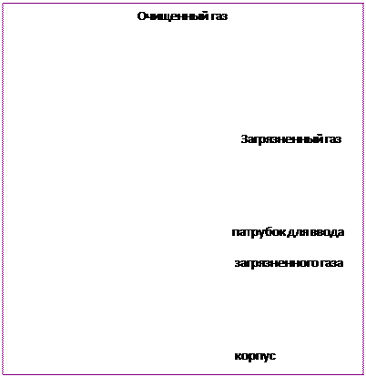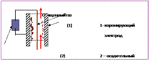 Электрофильтры. В основе работы электрофильтра лежит явление электризации взвешенных в газе частиц дисперсной фазы с последующим осаждением их на электроде с зарядом, противоположным по знаку заряду частиц загрязнений (осадительном электроде). По конструкции электрофильтры подразделяют на трубчатые и пластинчатые. В трубчатых электрофильтрах загрязненный газ пропускается по вертикальным трубам диаметром 20 – 25 см, по центру которых натянута проволока. Скорость движения газа в трубке составляет 0,5 - 2 м/с. Газ находится в трубке 6 – 8 с. Постоянный ток напряжением 50 – 100 кВ подается на электроды. Электродами являются стенки трубки (осадительный электрод) и проволока (каронирующий электрод).