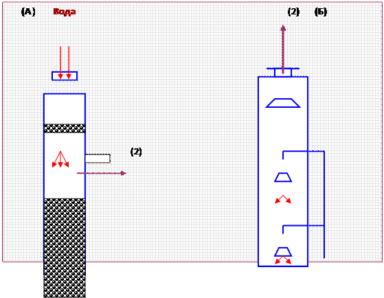 Мокрые пылеулавливающие аппараты работают по принципу улавливания частиц пыли поверхностью или объемом жидкости (воды). Эти аппараты характеризуются высокой степенью очистки от мелкодисперсной пыли. С их помощью можно очищать от пыли горячие и взрывоопасные газы. Эффективность работы аппаратов мокрой очистки зависит от смачиваемости пыли, площади соприкосновения запыленного потока газа с поверхность жидкости. Если пыль плохо смачивается водой, то в воду добавляют поверхностно активные вещества (ПАВ). Для увеличения поверхности контакта в аппараты мокрой очистки вводят специальные насадки из материалов инертных по отношению к воде и загрязнениям (в промывных башнях) или воду распыляют при помощи форсунок (форсуночные скрубберы). На рис.6 приведены схемы двух аппаратов мокрой очистки – промывной башни (А) и форсуночного скруббера (Б). Промывная башня является простейшим аппаратом мокрой очистки газов от пыли. Она представляет собой колонну, заполненную кольцами Рашига или каким-либо другим инертным материалом.
