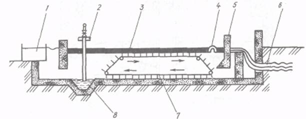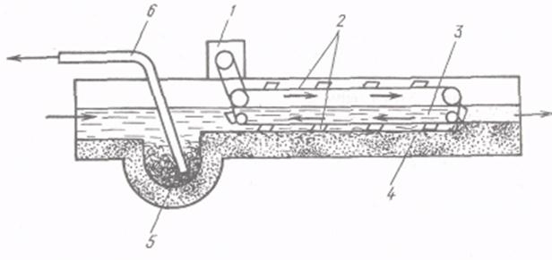 Рис. Принципиальная схема горизонтальной песколовки с прямолинейным движением воды: 1 - привод скребкового механизма; 2 - скребковый механизм; 3 ~ сточная вода; 4 - осевший песок; 5 - приемный бункер для песка; 6 - приемник грязевого насоса