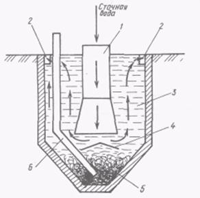 1-центральная труба;2-круговой водослив; 3- отстойная часть; 4- отражатель; 5- иловый колодец; 6-илопровод.
