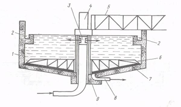 Радиальный отстойник представляет собой круглый бассейн из железобетона диаметром 50 м. Очищаемая от загрязнений вода подается через центральную распределительную трубу 3 и движется от центра к периферии с постоянно уменьшающейся скоростью, при этом скорость осаждения осадка остается постоянной во все время осаждения. Осветленная вода попадает в круговой водослив 2 у краев бассейна и оттуда по лотку подается к месту назначения. Выпавший осадок с помощью скребков 7, закрепленных на металлических фермах 6, сдвигается к центрально расположенному приямку 9.
