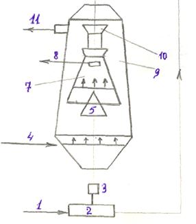 1— подача воды, 2,3-устройство соответственно для транспортировки и отбора ионита, 4 - подача СВ, 5-регулятор скорости движения потока воды в регенераторе, 6-подача регенерационного раствора, внутренний корпус для регенерации ионита, 8—отвод послерегенерационного раствора, 9 -ионообменная смола, 10 - воронка для приема отработанного ионита 11-выпуск отработанной СВ.