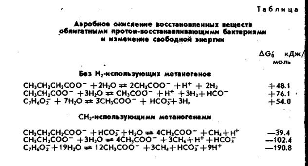 Из данных таблицы видно, что термодинамическая возможность протекания реакций разложения восстановленных продуктов определяется жесткими условиями в отношении парциального давления Н2. Расщепление пропионовой кислоты может происходить при парциальном давлении водорода ниже 9*105 атм. Аналогичные критические точки для конверсии бутирата и этанола равны 2*103 и 0,15 атм соответственно. Реакции анаэробного разложения жирных кислот называют также реакциями β-окисления.