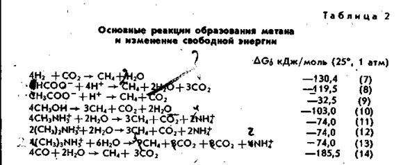 Метанобактерии могут использовать в качестве источников энергии и углерода ограниченное количество субстратов— всего 8: СО2+Н2, формиат, закись углерода, метанол, ацетат, моно-, ди- и триметиламины (табл. 2).