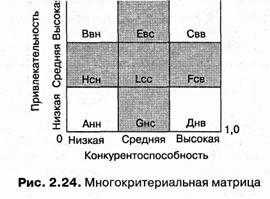 В зоне С рекомендуется стратегия агрессивного роста, в зоне А — стратегия продолжения деятельности без инвестиций (деинвестирование), в зоне В — стратегия селективного роста, в зоне Д — стратегия низкой активности. Промежуточные зоны дают характеристику менее четким стратегиям, которые могут иметь место на рынке. Индикаторами привлекательности и конкурентоспособности рынка могут выступать различные критерии, а не только относительная доля рынка и темпы роста рынка (рис. 2.25).