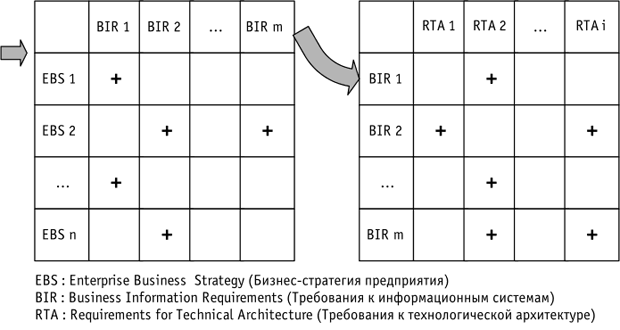 Рис. 8.6. Матрица связей между бизнес-стратегиями, требованиями к информационным системам и технологической архитектуре