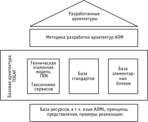 В состав модели TOGAF входят две основные компоненты – методика ADM (Architecture Development Method), определяющая процесс разработки архитектуры, и Базовая Архитектура (Foundation Architecture). Она дополняется соответствующей базой данных ресурсов, включающей описания архитектурных принципов, примеров реализации, а также специализированный язык ADML. Заметим, что в описании TOGAF добавлен специальный документ, поясняющий соответствие между понятиями TOGAF и моделью Захмана.