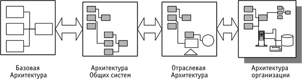 Следующая степень детализации реализуется на уровне Отраслевой Архитектуры, которая добавляет специфичные для каждой индустрии модели данных, приложения, стандарты, бизнес-правила, а также, при необходимости, процедуры взаимодействия различных отраслевых систем между собой. Наконец, на последнем уровне Архитектуры Организации формируется архитектура ИТ-систем конкретного предприятия, учитывающая все его особенности, в том числе наличие унаследованных систем, планы и возможности реализации, организацию данных на физическом уровне и т.п.
