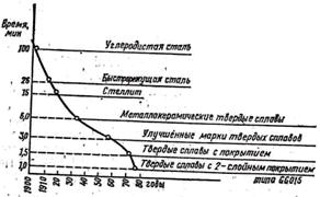 Эти два новых материала явились большим достижением в области обработки резанием. Для обточки стального валика диаметром 100 мм и длиной 500 мм резцом из инструментальной стали требовалось 100 мин машинного времени. Быстрорежущая сталь позволила сократить это время До 26 мин, а резцы из стеллита довели его до 15 мин.