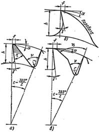 Форма и элементы зуба. Фрезы делаются с остроконечными (рис. 41. а) или затылованными зубьями (рис. 41,6). Известны три типа остроконечных зубьев: трапецеидальная форма (рис. 42, а), параболическая (рис. 42, б) и с двойной спинкой (рис. 42, в). Зуб трапецеидальной формы определяется углом