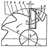 Поверхность 4, обращенная при резании к поверхности резания, называется задней поверхностью зуба. Поверхность 5, смежная с передней и задней поверхностями соседних зубьев, называется спинкой зуба. Режущая кромка 2 есть линия, образованная передней и задней поверхностями зуба.