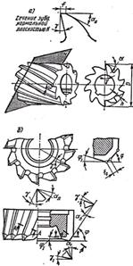 На рис. 44 показаны геометрические элементы режущей части фрезы. Главный передний угол у может быть положительным и отрицательным (рис. 44, а и б). У цилиндрических фрез из быстрорежущих сталей угол у принимают в пределах 10—20°, у торцовых и дисковых фрез с твердосплавными пластинками угол