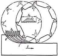 Подачей на зуб (sz мм/зуб) называется величина перемещения заготовки или фрезы за время поворота фрезы на один шаг, т. е. на угол между двумя соседними зубьями. На рис. 46 показаны срезы стружки, снимаемой зубьями 1, 2, 3, 4,..., 8, соответствующие подачам s1, s2, s3,..., s8.