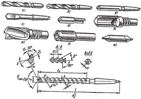 Рис. 54. Виды сверл: а, б — спиральные, в —с прямыми канавками, г — перовое, д — ружейное, е — однокромочное с внутренним отводом стружки, ж – двухкромочное, з – для кольцевого сверления, и – центровочное, к – шнековые.