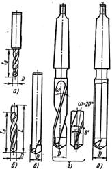 Рис. 55. Сверла из твердого сплава: а — со стальным хвостовиком, б — изготовленное по методу ВНИИ, в —с косыми канавками, оснащенное твердым сплавом, г —спиральное, оснащенное пластинойиз твердого сплава, д—с прямыми канавкамии твердосплавной пластинкой