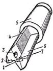Сверла с поворотными неперетачиваемыми твердосплавными пластинками. На рис. 56 показано сверло с двумя треугольными неперетачиваемыми твердосплавными пластинками. Пластинки 1 и 2 расположены в двух прямоугольных канавках 6 в специальных гнездах 3 и закреплены болтами 7. Пластинки расположены так, что их режущие кромки образуют взаимно перекрывающие поверхности резания. Пластинки являются как бы токарными резцами, укрепленными в державке 4, вставленной во втулку 5. Процесс