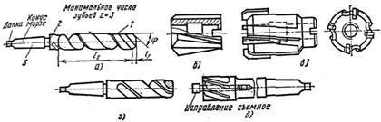 Зенкеры с коническим хвостовиком (рис. 58,а) с минимальным количеством зубьев z<3, диаметром 10 мм и выше применяются для окончательной обработки и под развертывание. Зенкеры насадные и со вставными ножами (рис. 58, б и в) применяются для обработки отверстий.