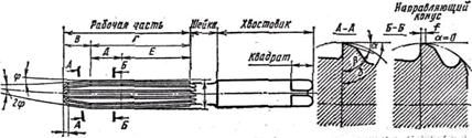 Калибрующая часть развертки состоит из двух участков: цилиндрического Д и конического Е, так называемого обратного конуса. Обратный конус делается для уменьшения трения инструмента об обработанную поверхность и увеличения диаметра отверстия. Передний угол развертки у равен 0—10° (0° принимается для чистовых работ и при резании хрупких металлов). Задний угол а на режущей части развертки делается 6—15° (большие значения для малых диаметров). Задний угол на калибрующей части равен нулю, так как имеется цилиндрическая ленточка.