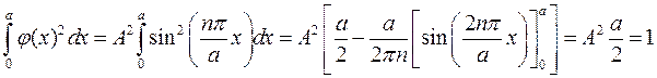 Поскольку вероятность частице находиться на краях ямы, где потенциальная энергия бесконечна, может быть только равна нулю, то граничные условия при х =0 и х = а имеют вид: