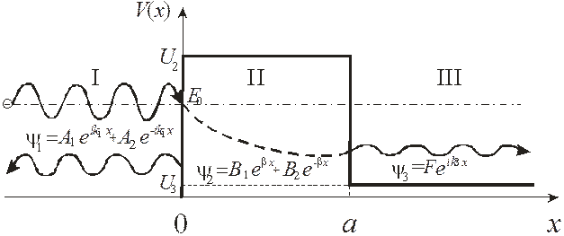 Туннельный эффект – чисто квантовый эффект, заключающийся в проникновении частицы сквозь потенциальный барьер при ее собственной энергии меньшей, чем высота барьера. Рассмотрим свободный электрон с энергией Е 0, движущийся в положительном направлении оси х к потенциальному барьеру высотой U 2 (рис. 5.3).