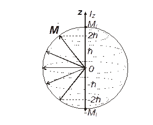В состояниях, в которых М2 и Мz имеют определенные значения, проекции Мх и Му не имеют определенных значений (кроме случая l =0). Это означает, что в соответствии с принципом неопределенности частица при вращательном движении, так же как и при поступательном, не локализована в точке, а вектор момента импульса равновероятно может иметь любое направление в пределах конической поверхности, определяемой проекцией на ось z (рис. 8.1).