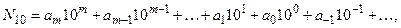 Всякое число в десятичной системе счисления можно представить, в соответствие с формулой 1.1.1, суммой различных целых степеней десяти (S = 10) с соответствующими коэффициентами ai (0, 1, 2,... 9):