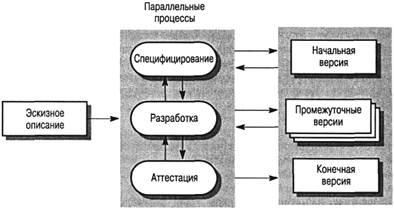 Эта модель основана на следующей идее: разрабатывается первоначальная версия программного продукта, которая передается на испытание пользователям, затем она дорабатывается с учетом мнения пользователей, получается промежуточная версия продукта, которая также проходит "испытание пользователем", снова дорабатывается и так несколько раз, пока не будет получен необходимый программный продукт (рис. 3.2). Отличительной чертой данной модели является то, что процессы специфицирования, разработки и аттестации ПО выполняются параллельно при постоянном обмене информацией между ними.