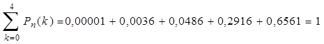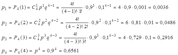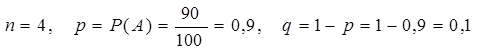 Пример 1: Проверкой качества установлено, что из каждых 100 приборов не имеют дефекты 90 штук в среднем. Составить биномиальный закон распределения вероятностей числа качественных приборов из приобретенных наугад 4.