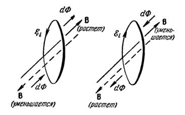 Знак «-» определяется правилом Ленца: индукционный ток в контуре имеет такое направление, чтобы своим магнитным полем препятствовать изменению магнитного потока, вызвавшего этот индукционный ток.