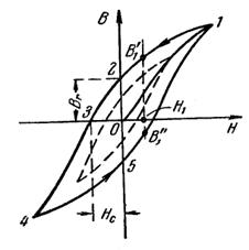 График зависимости поля внутри ферромагнетика от напряженности внешнего магнитного поля называется петлей Гестерезиса. Намагничивание ферромагнетика из не намагниченного состояния происходит по кривой 0-1, тока 1 соответствует намагниченности до насыщения. При уменьшении напряженности внешнего магнитного поля, размагничивание происходит по другому пути 1-2, точка 2 – соответствует остаточной намагниченности, намагниченности при отсутствии внешнего магнитного поля. Чтобы полностью размагнитить ферромагнетик, нужно приложить внешнее поле в противоположном направлении 2-3, НС – коэрцитивная сила – напряженность внешнего магнитного поля, необходимая, чтобы полностью размагнитить ферромагнетик. Если продолжать увеличивать напряженность внешнего магнитного поля, то ферромагнетик начнет намагничиваться по кривой 3-4, дальше процесс повторяется.