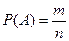 Определение. Вероятностью события A называется отношение числа m элементарных исходов, благоприятствующих событию A, к общему числу n всевозможных элементарных исходов испытания.