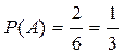 2. Испытание − бросание игральной кости. Событие A − на игральной кости выпадет менее 3 очков. Это испытание имеет следующие элементарные исходы: {1; 2; 3; 4; 5; 6}. Из них событию A благоприятствуют исходы {1; 2}. Поэтому n =6, m =2. Значит,