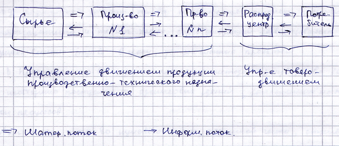 Рассмотрим принципиальную схему сквозного материального потока основного объекта логистики, начиная от первичного источника сырья, вплоть до конечного потребителя. Весь путь движения материалов на этой схеме можно разделить на 2 больших участка: на первом участке движется продукция производственно-технического назначения, на втором изделие народного потребления. Качественный состав потока, по мере движения по цепи меняется. В начале между источником сырья и первым перерабатывающим предприятием, а также между различными производствами движутся, как правило, массовые однородные грузы. В конце цепи материальный поток разнообразными, готовыми к потреблению товарами. Внутри отдельных производств также имеют место материальные потоки: здесь между цехами или же внутри цехов перемещаются различные детали, заготовки полуфабрикатов.