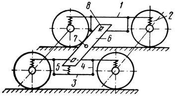 1 – боковые балки рамы тележки; 2 – буксовое рессорное подвешивание; 3 – поддон люльки; 4 – подвески; 5 – центральная система рессорного подвешивания; 6 – балка; 7 – шкворень; 8 – скользуны
